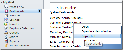 When you paste the link, it will look something like this: Customer Service Performance Dashboard <https://avanade45.crm.dynamics.com/workplace/home_dashboards.aspx?dashboardId=%7b2e3d0841-fa6d-df11-986c-00155d2e3002%7d&dashboardType=1030&sitemappath=Workplace%7cMyWork%7cnav_dashboards>